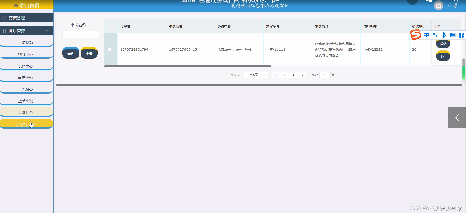 小说订单管理,在小说订单管理页面可以查看订单编号、小说编号、小说名称、卖家编号、小说简介、用户编号、小说单价等信息,并可根据需要对订单管理进行详情,修改,删除或查看详细内容等操作,如图5-9所示。