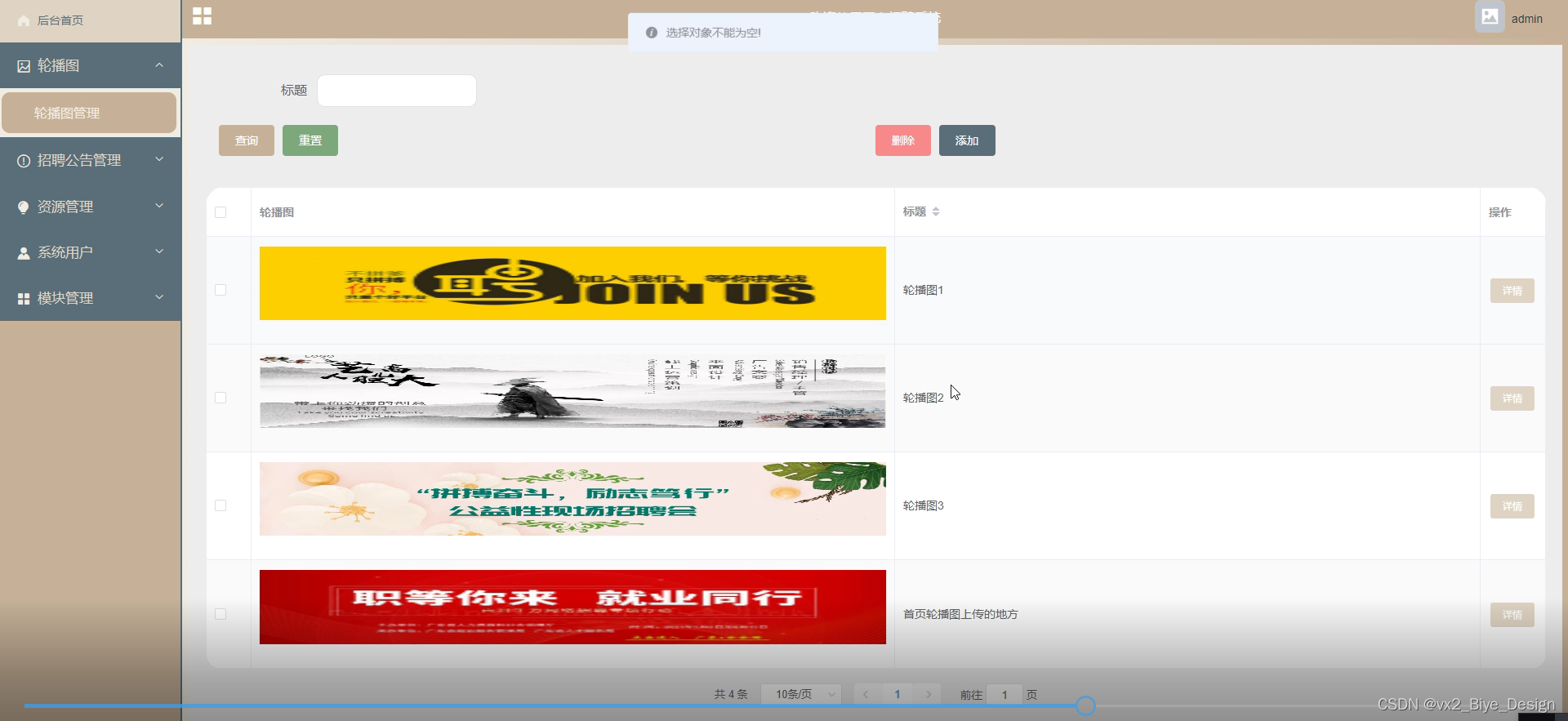 (2)招聘公告管理:管理员可以对系统前台展示的招聘公告进行增删改查,方便用户进行查看。