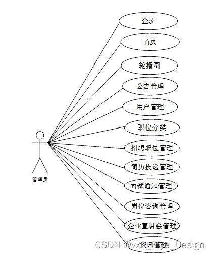 web后台管理上的管理员是维护整个网上招聘系统中所有数据信息的。管理员角色用例如图2-4所示。