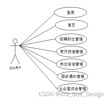企业用户可以发布职位信息查看简历以及进行面试通知操作。企业用户角色用例如图2-5所示。