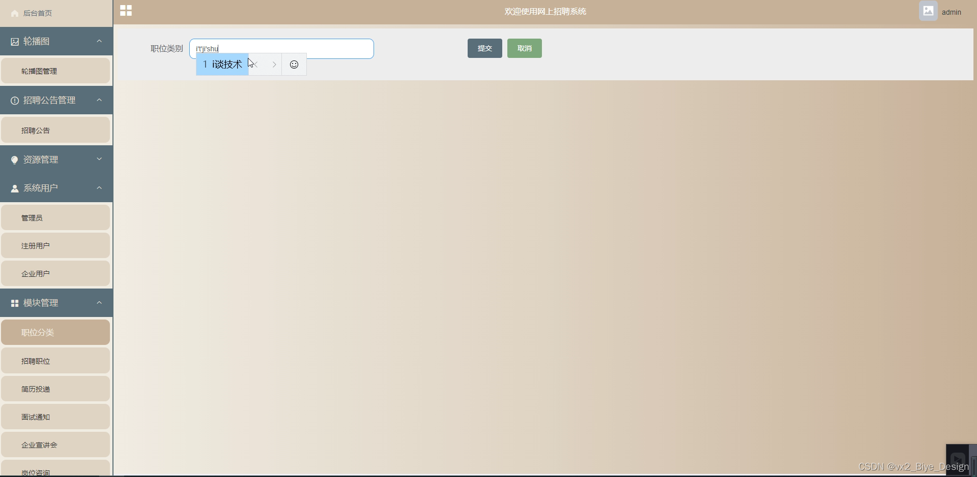 (2)网上招聘系统 中的web后台管理中的前端使用的是JavaScript框架,它配合ajax和jquery可以美化页面设计。