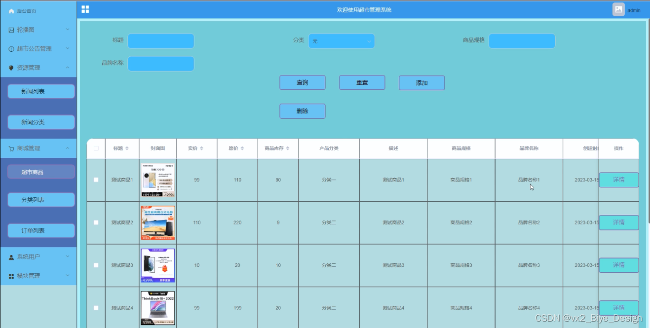 超市管理系统中的管理人员是可以对超市管理系统内的发布的超市商品进行维护和管理的,支持增删改查操作。界面如下图4-11所示。