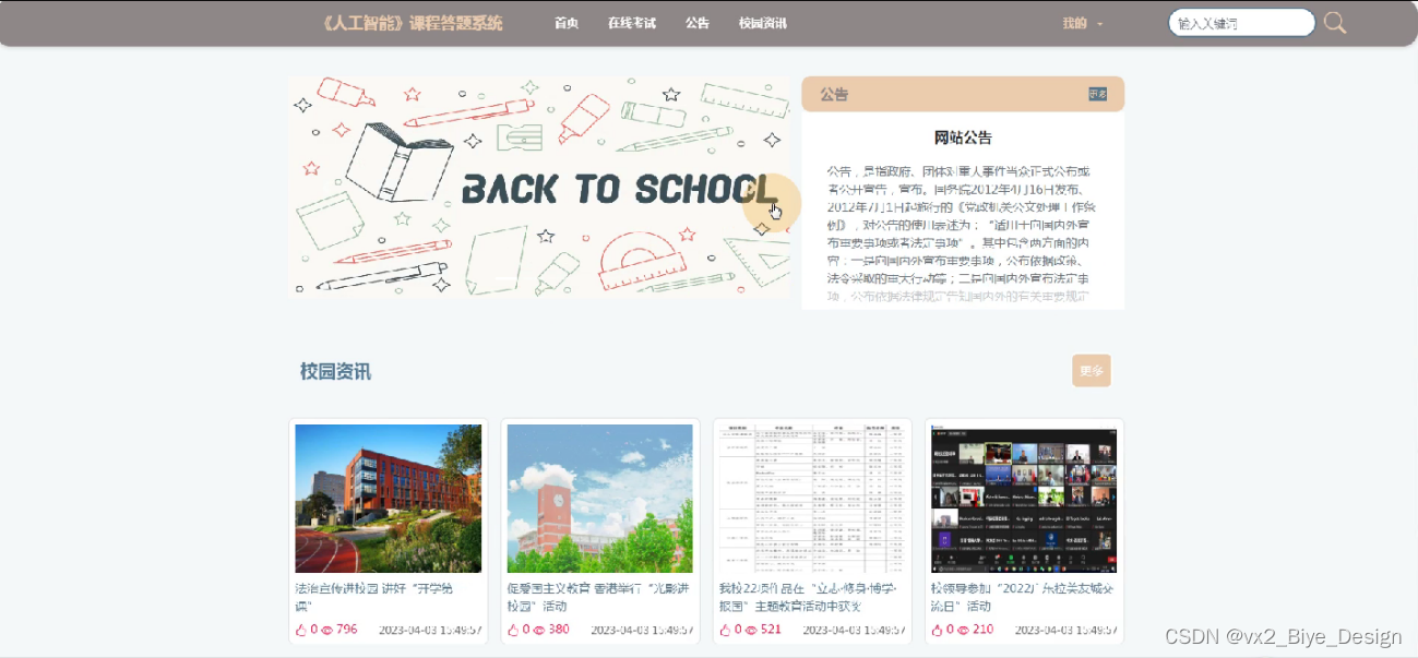 学生用户登录《人工智能》课程答题系统,功能为:首页,公告,校园资讯,在线考试,我的(我的账户,我的收藏,个人中心),后台首页,模块管理(学生信息、学生成绩)等功能,如下图所示: