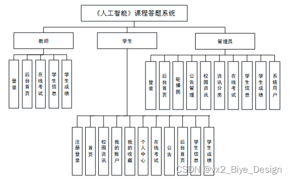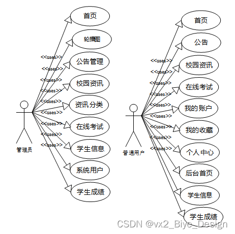 (1)功能要求:首页,轮播图,公告管理,资源管理(校园资讯、资讯分类、在线考试),系统用户(管理员,学生,教师),模块管理(学生信息、学生成绩)等功能模块。