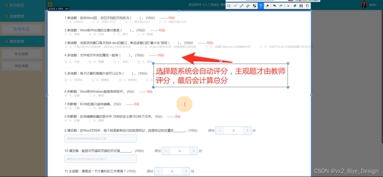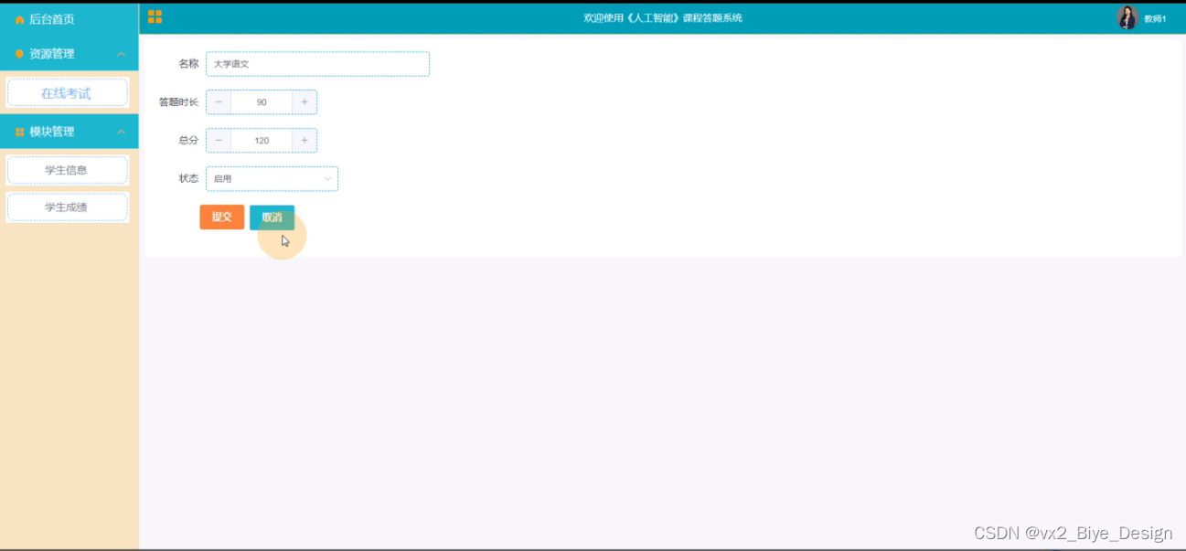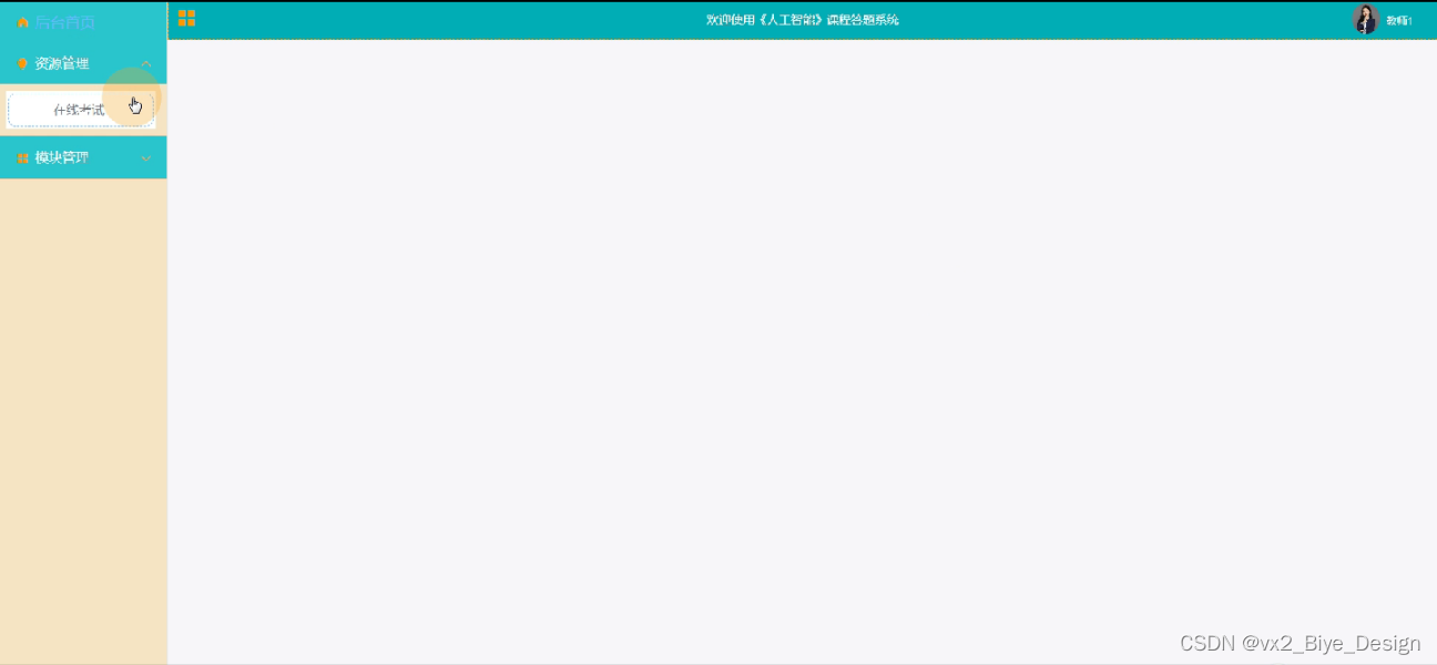 教师用户登录《人工智能》课程答题系统,功能为:后台首页,资源管理(在线考试)模块管理(学生信息、学生成绩)等功能,如下图所示: