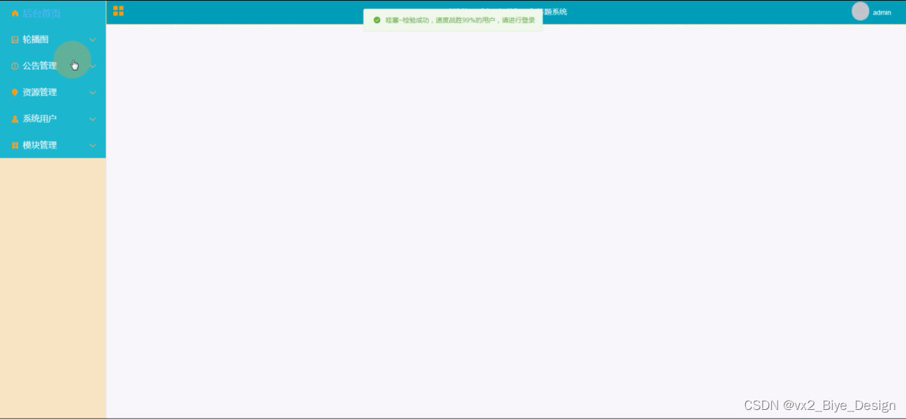 管理员登录《人工智能》课程答题系统,管理员后台功能为:后台首页:轮播图,公告管理,资源管理(校园资讯、资讯分类、在线考试),系统用户(管理员,学生,教师),模块管理(学生信息、学生成绩)等功能,如下图所示:
