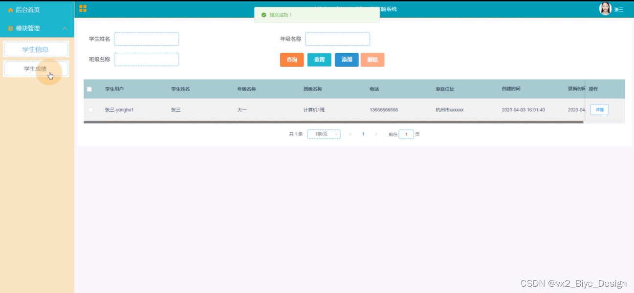 学生信息:用户在后台可查看学生用户、学生姓名、年级名称、班级名称、电话、家庭住址等信息,可进行添加、重置、查询等操作,如下图所示: