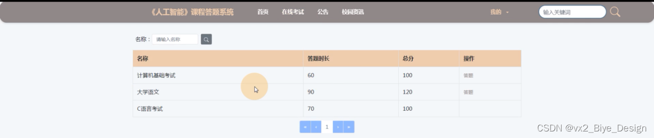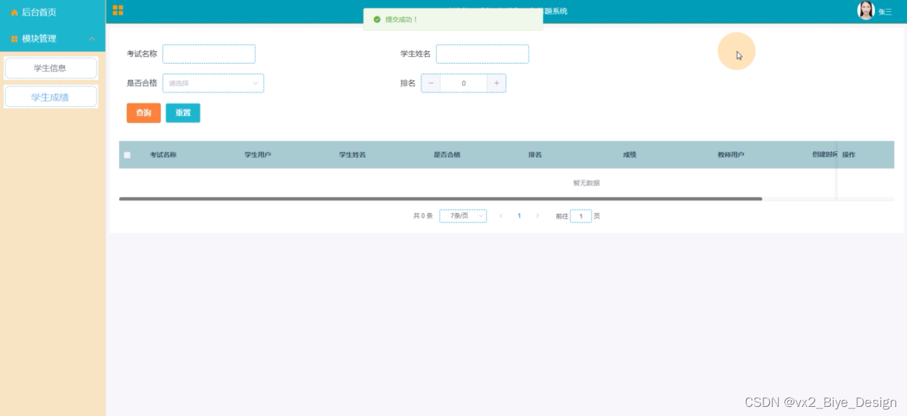 在线考试, 在前台界面图可通过搜索名称进行查找自己需要的考试课题,可进行在线答题,在后台可查询成绩,如下图所示。