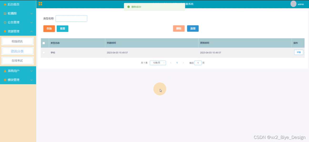 3、功能的完善性:拥有首页,轮播图,公告管理,资源管理(校园资讯、资讯分类、在线考试),系统用户(管理员,学生,教师),模块管理(学生信息、学生成绩)等功能的修改维护操作。