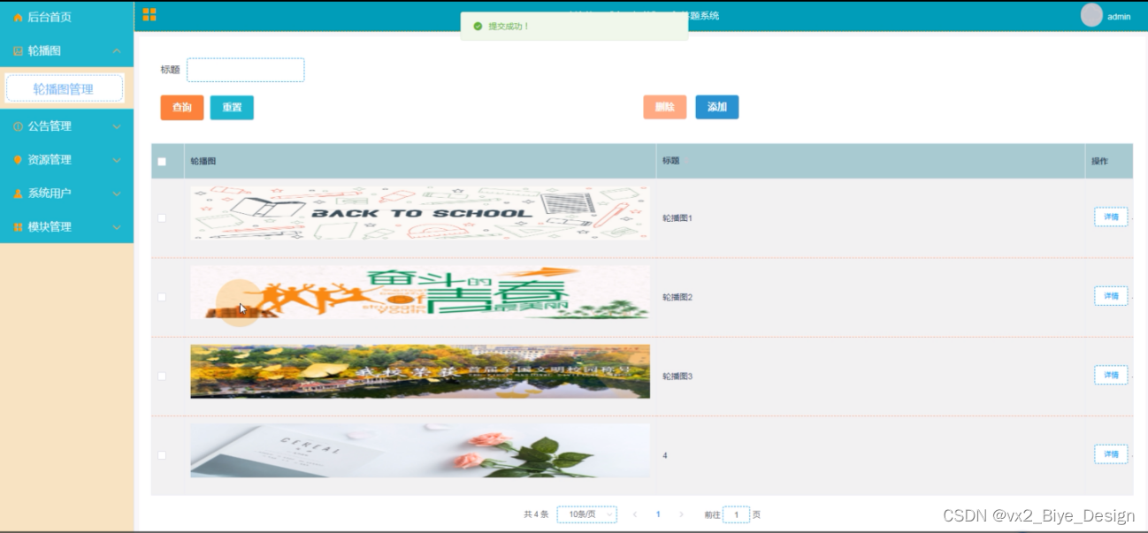 轮播图管理,在此界面图可查看调查轮播图片,标题等信息,还可在此页面进行重置,删除,添加等操作,如图5-7所示: