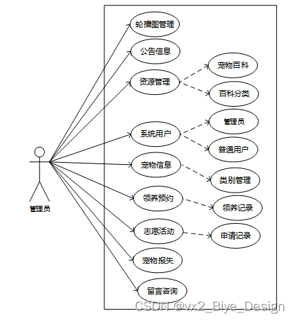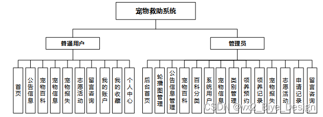 (1)功能要求:可以管理首页,轮播图管理,公告信息管理,资源管理(宠物百科,百科分类),系统用户(管理员,普通用户),模块管理(宠物信息,类别管理,领养预约,领养记录,宠物报失,志愿活动,申请记录,留言咨询)等功能模块。