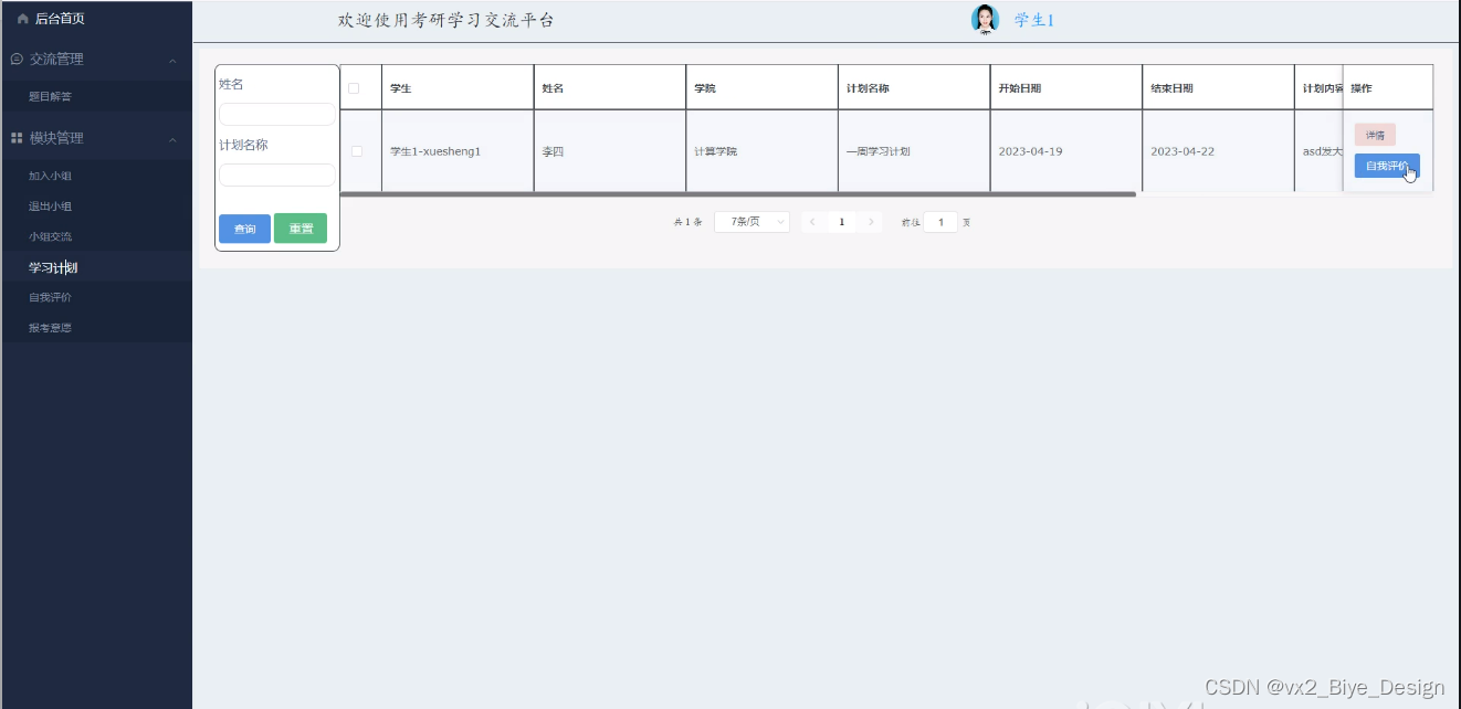 学习计划,在学习计划中可以查看学生、姓名、学院、计划名称、开始日期、结束日期、计划内容等并进行自我评价等操作,如图4-13所示。