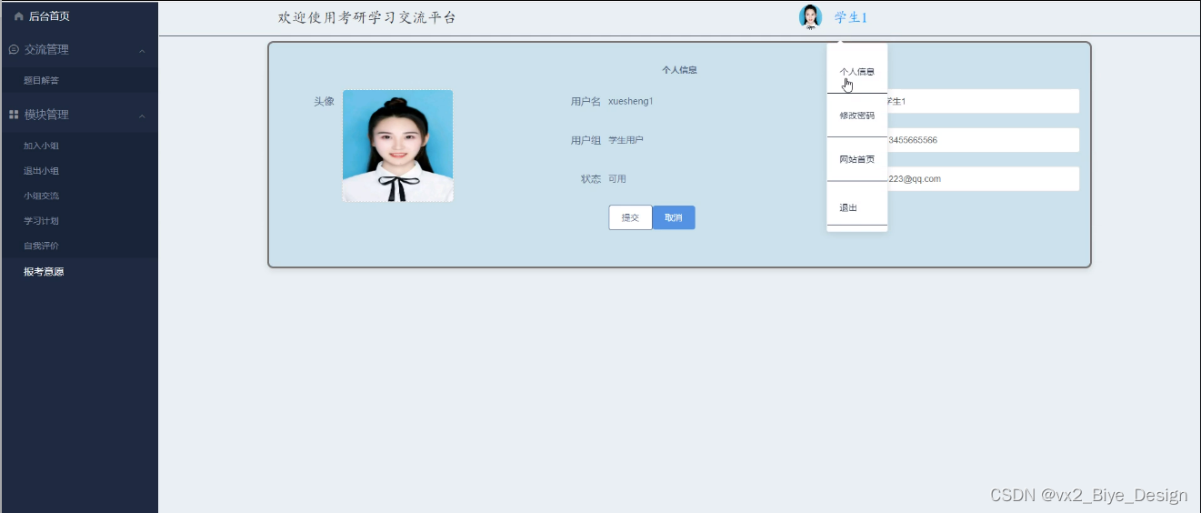 用户登录进入考研学习交流平台可以查看首页、交流管理(题目解答)、模块管理(加入小组、退出小组、小组交流、学习计划、自我评价、报考意愿)、个人中心等内容,如图4-10所示。