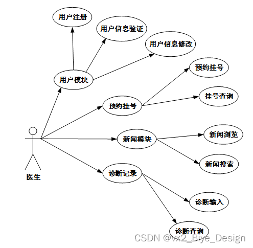 2.医生用户主要使用系统的医院预约挂号业务,下图所示为医生用户的用例图。