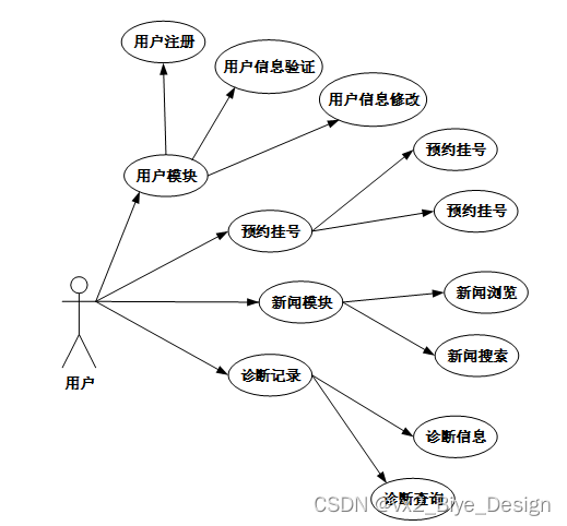 1.普通用户主要使用系统的医院预约挂号,下图所示为普通用户的用例图。