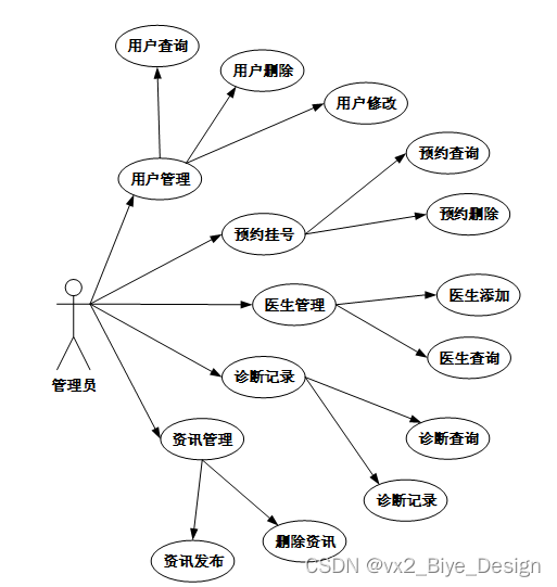 3.管理员主要负责首页、站点管理(轮播图、公告栏)用户管理(管理员、系统用户、医生用户)内容管理(医疗资讯、资讯分类)更多管理(诊断记录、科室分类、医生信息、预约挂号),下图所示描述管理员的用例图。