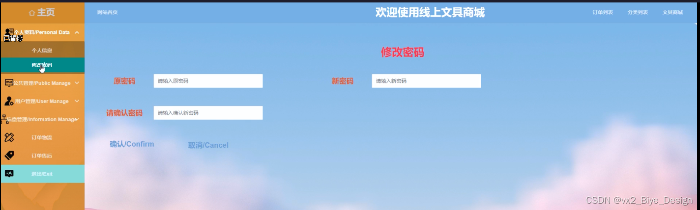 用户使用该线上文具商城 注册完成后,用户对登录密码有修改需求时,系统也可以提供用户修改密码权限。系统中所有的操作者能够变更自己的密码信息,执行该功能首先必须要登入系统,然后选择密码变更选项以后在给定的文本框中填写初始密码和新密码来完成修改密码的操作。在填写的时候,假如两次密码填写存在差异,那么此次密码变更操作失败,下面的图片展示的就是该板块对应的工作面。