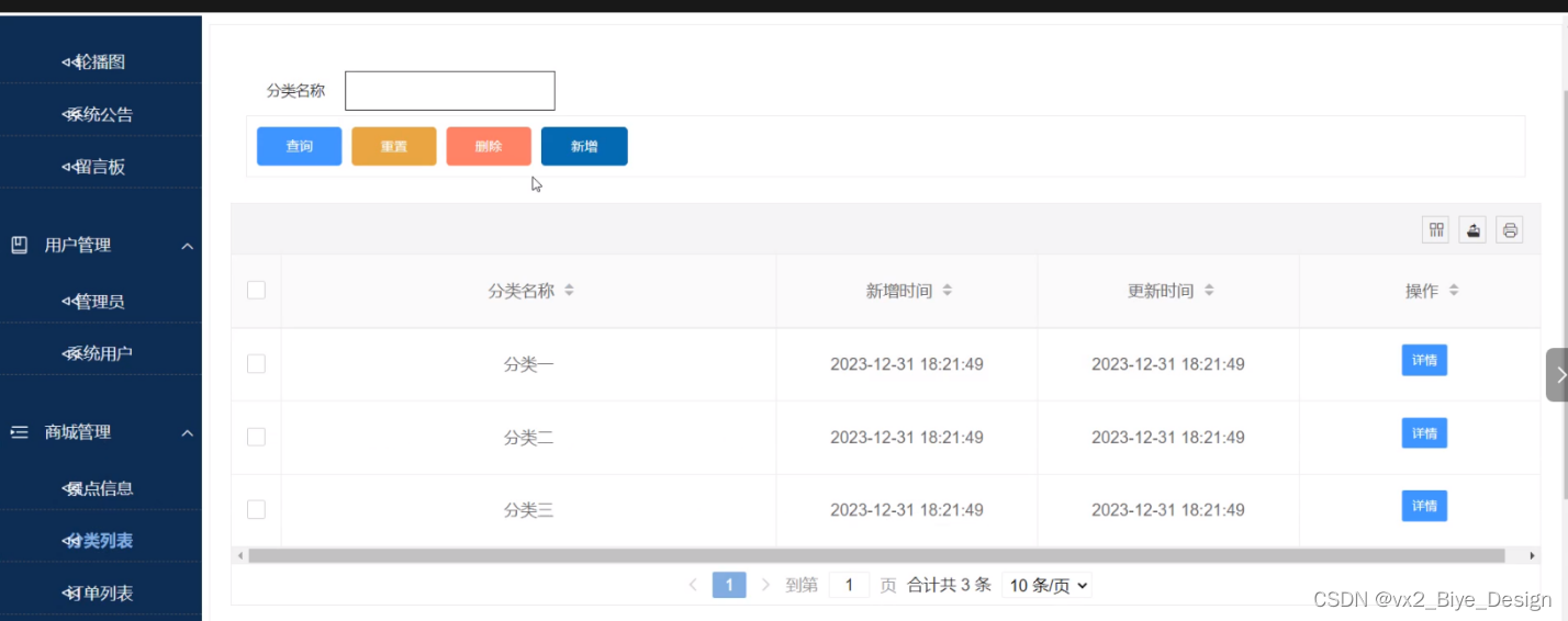 (11)美食分类:管理员可以对美食分类信息进行查询、重置、添加和删除操作。