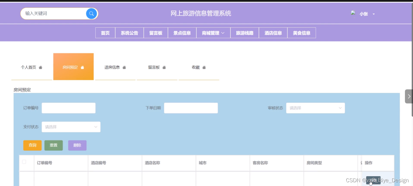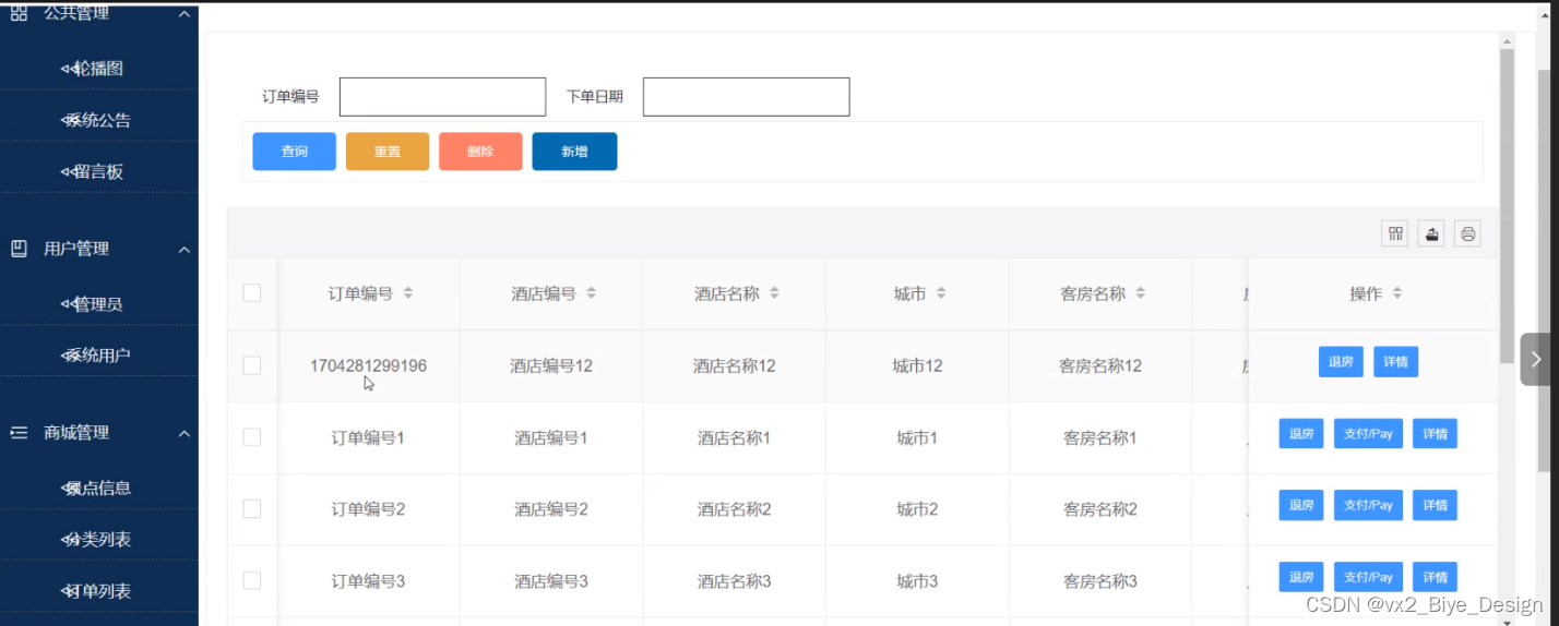 - 房间预定:管理员可以查看预定预定列表中某一预定信息详情等,可以对房间预定信息进行查询、添加、重置和删除操作