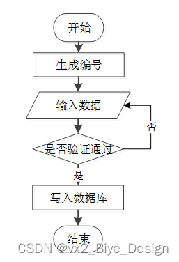 用户成功登入系统后就能够实现增加数据的操作,增加数据的编号由系统生成,用户不能随意填写,除了编号以外,其他增加信息用户自己填写,填写后的信息经过系统验证,验证通过后即可完成数据新增,数据新增的流程图如下图2-1所示。