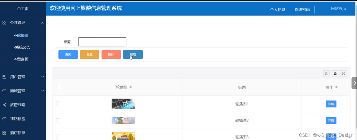 - 公共管理:管理员查看和管理轮播图、系统公告和留言板信息。