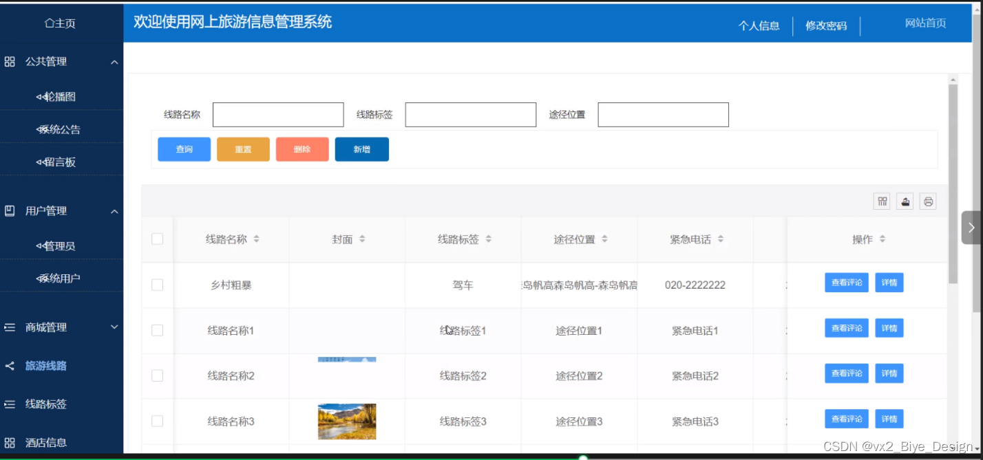 - 旅游路线:管理员可以查看旅游路线列表中某一路线信息详情和评论信息,可以对旅游路线信息进行查询、重置、添加和删除操作。