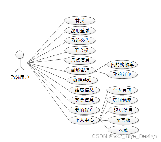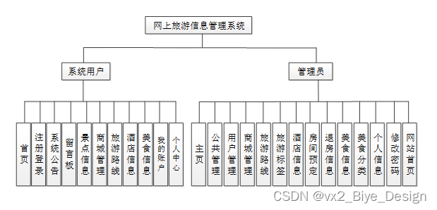 按照网上旅游信息管理系统的角色,主要包括系统用户模块和管理员这两大功能模块,各模块功能内容如下: