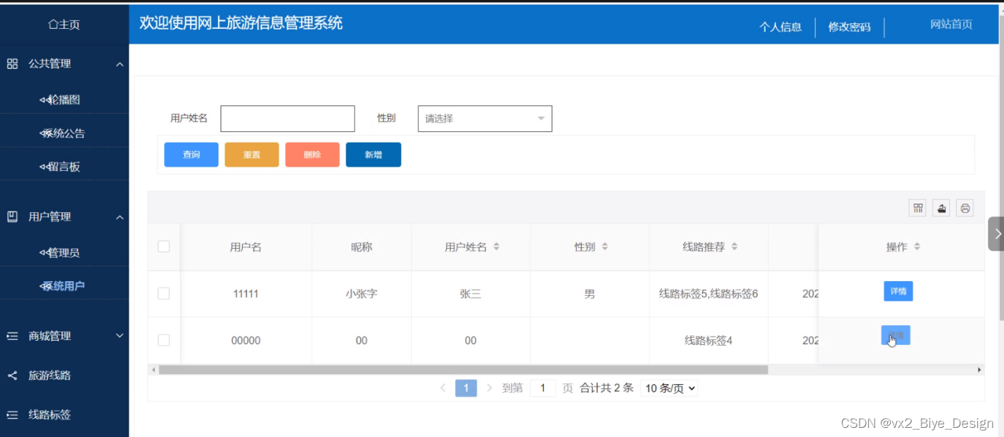- 用户管理:管理员可以查看用户列表中某一用户信息详情,可以对用户信息进行查询、重置、添加和删除操作