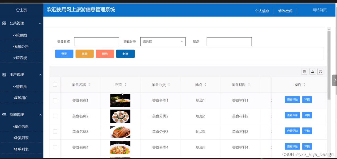 (10)美食信息:管理员可以对美食信息进行查询、重置、添加和删除操作。