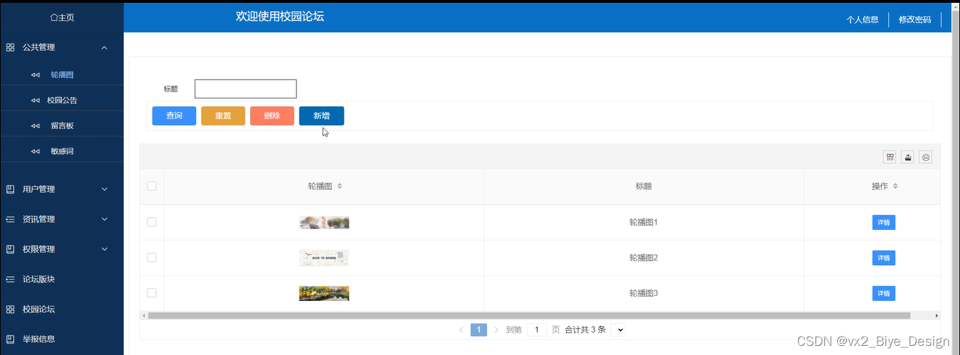 公共管理:管理员点击可查看轮播图、校园公告、留言板和敏感词。如需添加新的轮播图,点击右侧“添加”按钮,上传图片,输入标题,点击“确认”按钮进行添加;如需添加新的校园公告,点击右侧“添加”按钮,输入标题和正文,点击“确认”按钮进行添加。同时可对留言消息进行回复操作,对敏感词进行增删改查。界面图如下。