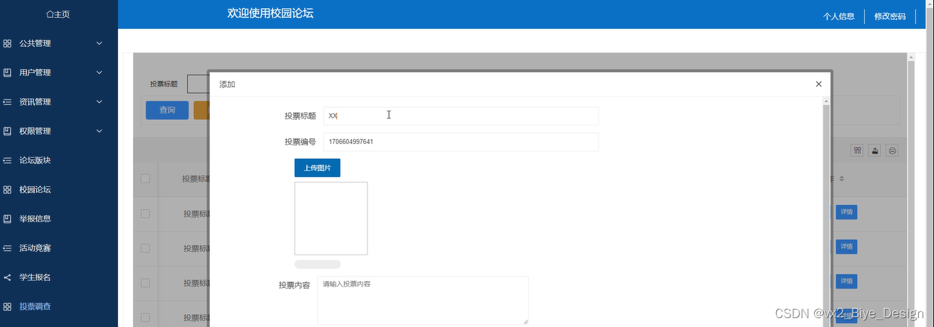 投票调查:管理员点击可查看投票调查列表,如需添加新的投票,点击右侧“添加”按钮,输入投票标题、投票编号,上传图片,输入投票内容、计时器标题,选择日期范围,点击“确认”按钮进行添加。界面图如下。