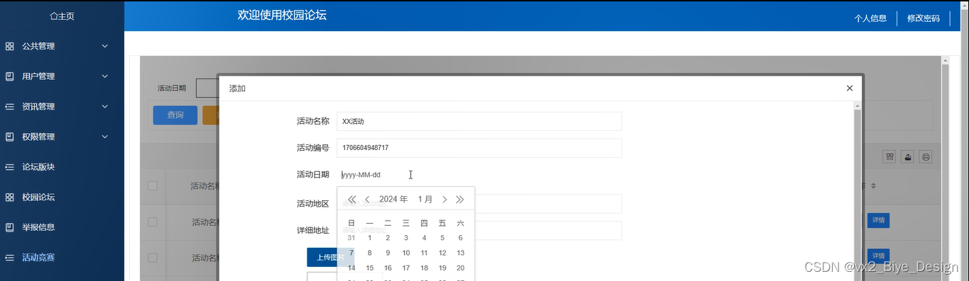 活动竞赛:管理员点击可查看活动竞赛列表,如需添加新的活动竞赛,点击右侧“添加”按钮,输入活动名称、活动编号、选择活动日期,输入活动地区、详细地址,上传图片,输入活动详情,点击“提交”按钮进行添加。界面图如下。
