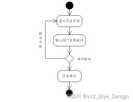 用户可进行登录使用更多功能,首先进入用户登录界面,输入用户账号和密码,后台对账号和密码信息进行核对验证,验证成功则页面直接显示登录用户昵称代表登录成功,否则返回用户登录界面。用户登录活动图如下图。