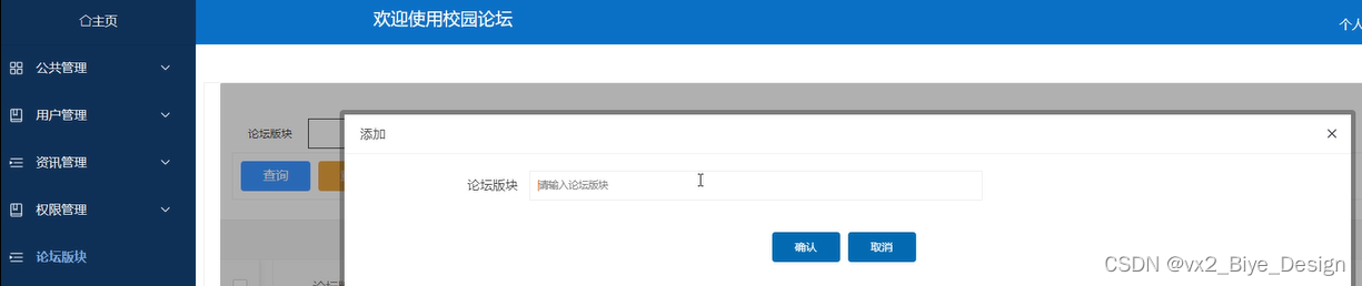 (2)公共管理:管理员点击可查看轮播图、校园公告、留言板和敏感词。如需添加新的轮播图,点击右侧“添加”按钮,上传图片,输入标题,点击“确认”按钮进行添加;如需添加新的校园公告,点击右侧“添加”按钮,输入标题和正文,点击“确认”按钮进行添加。同时可对留言消息进行回复操作,对敏感词进行增删改查。