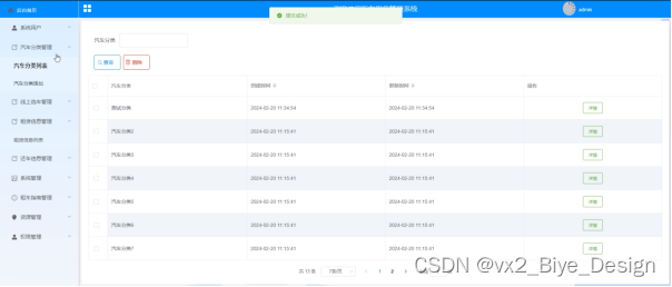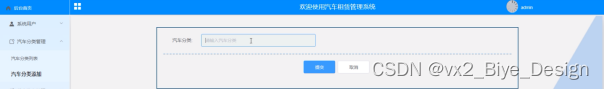 在后台的“汽车分类管理”页面可查看所有的汽车分类信息,包括汽车分类、创建时间和更新时间。还可以添加新的汽车分类列表。还可以进行查询、重置和删除等操作。界面如下图所示。