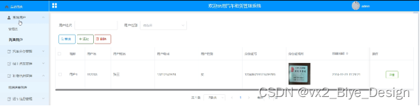 管理员点击“系统用户”菜单下单“用户管理”按钮可以查看到所有的用户,如果想要填写新的用户,点击右侧的“添加”按钮,然后输入昵称、用户名、用户姓名、用户电话、用户性别等信息,点击“提交”按钮进行提交,同时也支持对已有的用户进行编辑、删除和查询。用户管理界面如下图所示。