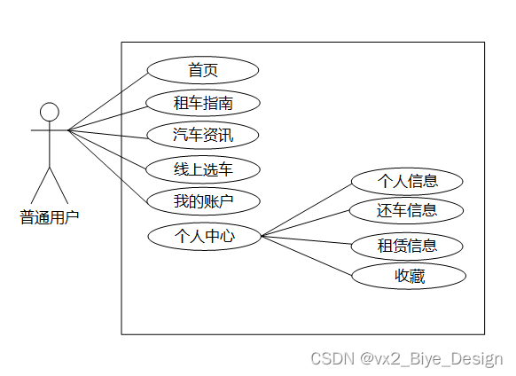 汽车租赁管理系统系统中普通用户角色功能包含了首页、租车指南、汽车资讯、线上选车、我的账户、个人中心(个人首页、租赁信息、还车信息、收藏)等功能,普通用户的用例图如图2.2所示: