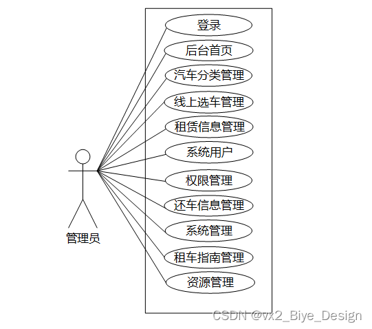 汽车租赁管理系统系统中管理员角色功能包含了后台首页、系统用户、汽车分类管理、线上选车管理、租赁信息管理、还车信息管理、系统管理、租车指南管理、资源管理、权限管理等功能,管理员的用例图如图2.3所示: