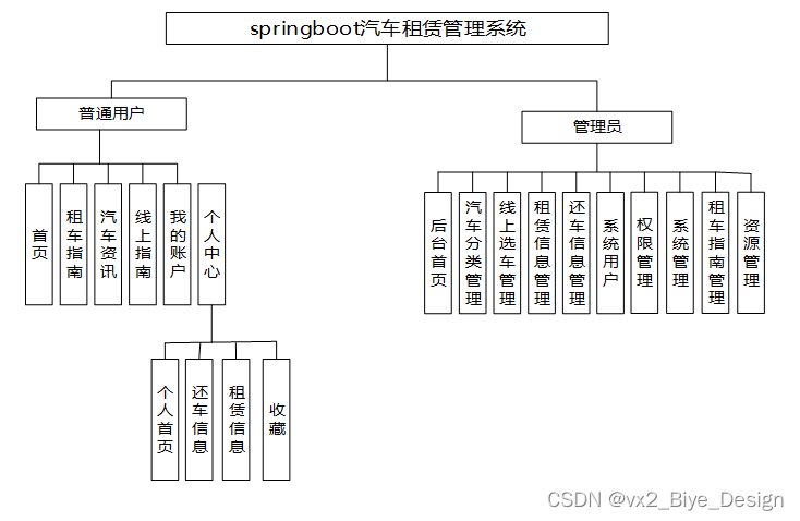 汽车租赁管理系统系统的开发主要是解放双手,提高效率,为企业的发展进行添砖加瓦,所以在系统的功能方面我们首先要从企业管理的角度进行,然后再从用户的角度进行,确保能够满足每个用户的需求,因此在功能上主要规划了普通用户和管理员两大部分,实现了注册登录、线上选车管理、租赁信息管理、还车信息管理、系统管理、租车指南管理、资源管理、权限管理等功能。