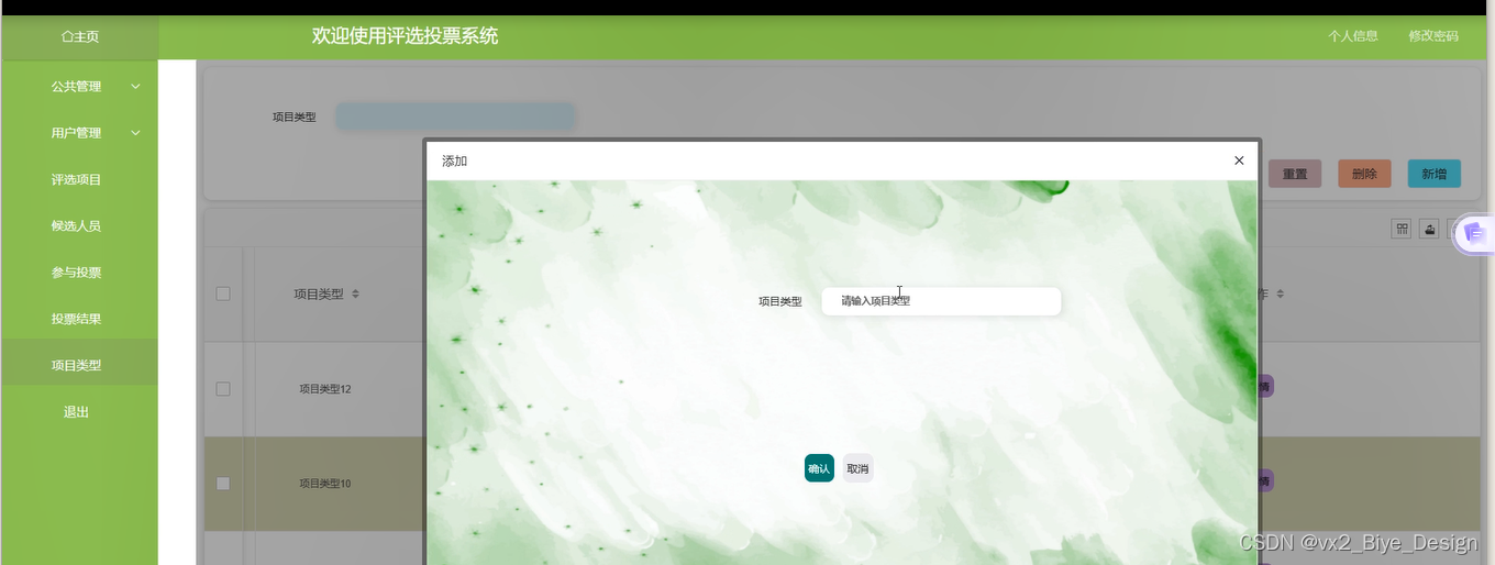 评选项目:管理员点击可通过搜索项目主题或选择项目类型进行搜索评选项目;如需新增新的评选项目,点击右侧“新增”按钮,输入项目主题,选择项目类型,上传图片,输入评选时间和项目内容,点击“确认”按钮进行添加。如图5-10所示。