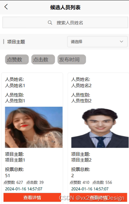 候选人员:用户可通过搜索项目主题进行搜索相关候选人,同时可进行点赞、收藏、评论和投票操作。界面图如下: