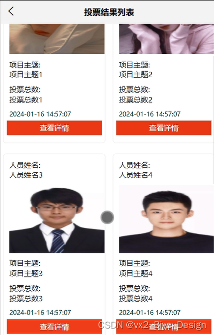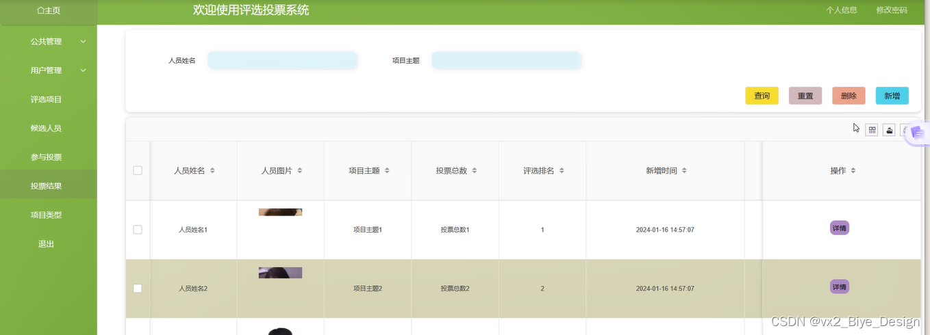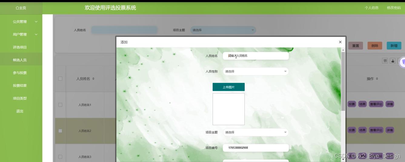 投票结果:管理员点击可查看投票结果,如需添加新的“投票结果”,点击右侧“新增”按钮,输入人员姓名,上传图片,输入项目主题、投票总数、和评选排名,点击“确认”按钮进行添加。界面图如下。