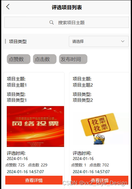 在评选项目页面,用户可以轻松获取有关评选项目的详细信息,还可以通过关键字快速搜索,同时还可以进行点赞、收藏等功能,如图5-4所示。