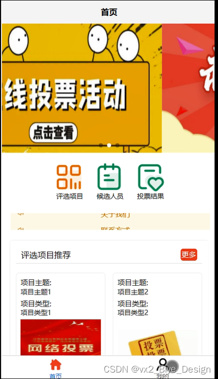 在首页,用户可以轻松访问评选项目、候选人员投票结果、通知公告和我的(等多种功能,如图5-3所示,为用户提供了更加便捷的服务。
