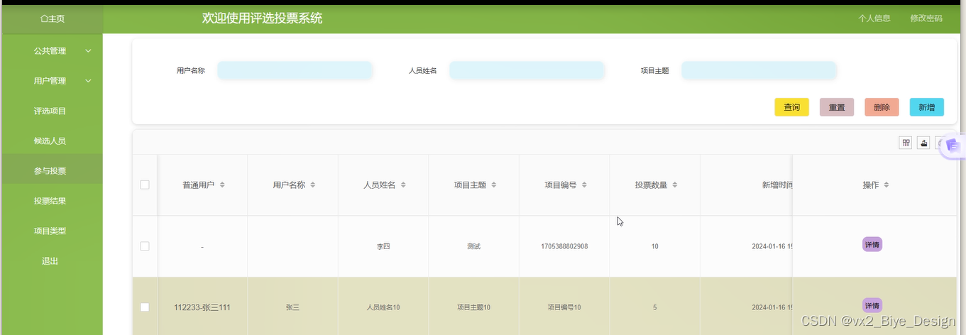 参与投票:管理员可通过搜索人选姓名和项目主题进行搜索候选人进行投票,界面图如下。