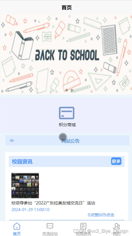 (2)交流论坛:当用户点击下方导航栏“交流论坛”这一菜单按钮,会显示管理员在后台发布的所有的论坛信息,可以查看详情,进行收藏、点赞、评论等。