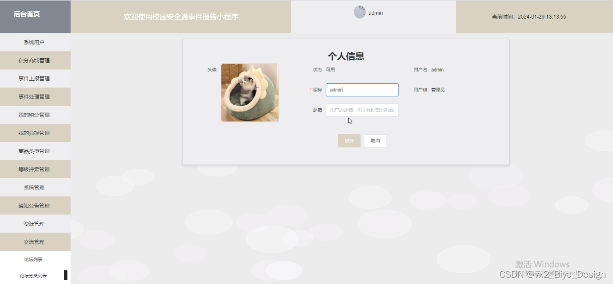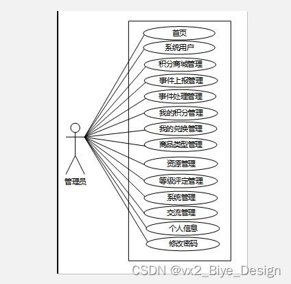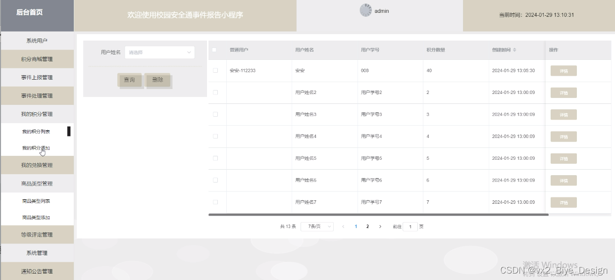 通过管理员功能页面,用户可以查看首页、系统用户(管理员、普通用户)、积分商城管理、事件上报管理、事件处理管理、我的积分管理、我的兑换管理、商品类型管理、等级评定管理、系统管理、通知公告管理、资源管理(校园资讯、资讯分类)、交流管理(论坛列表、论坛分类列表)、个人信息、修改密码等,并且可以根据需要进行相应的操作,如图5-7所示。