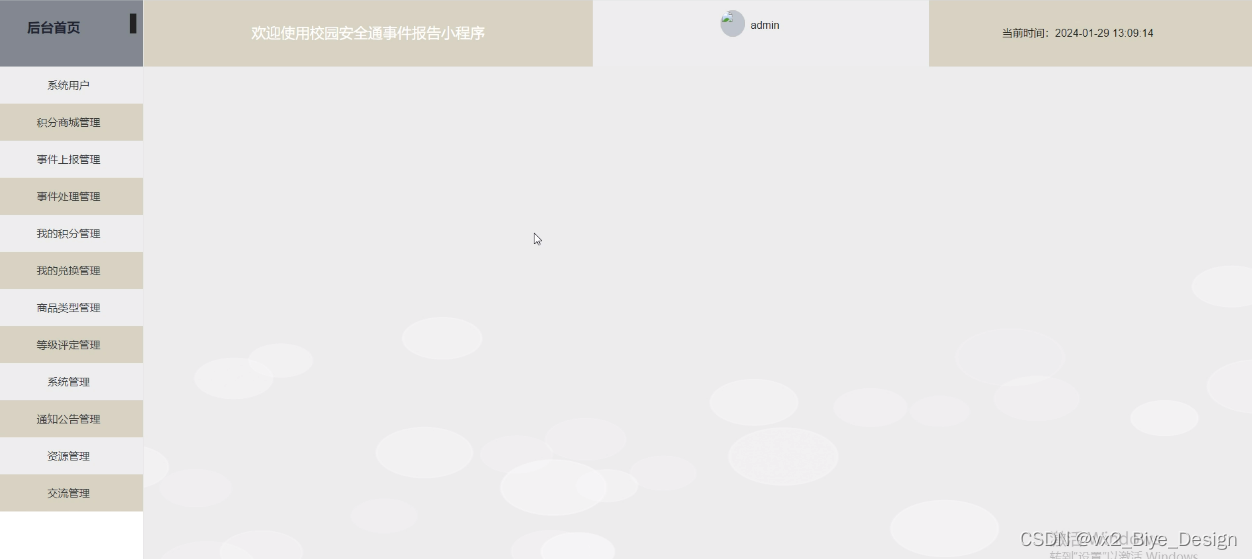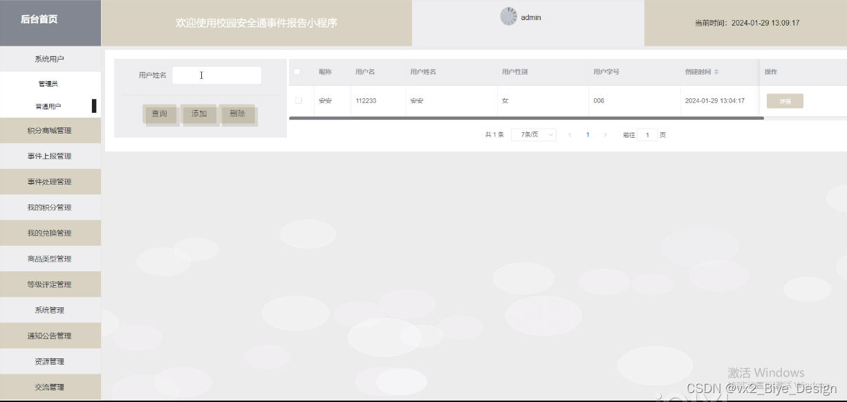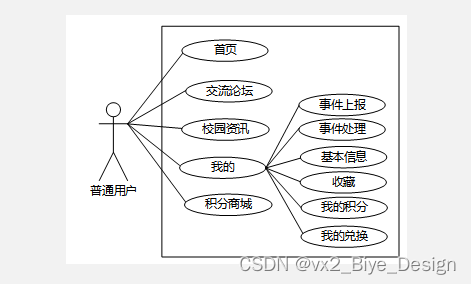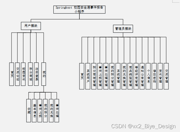 校园安全通事件报告小程序系统我划分为了用户管理模块和管理员模块这两大部分。