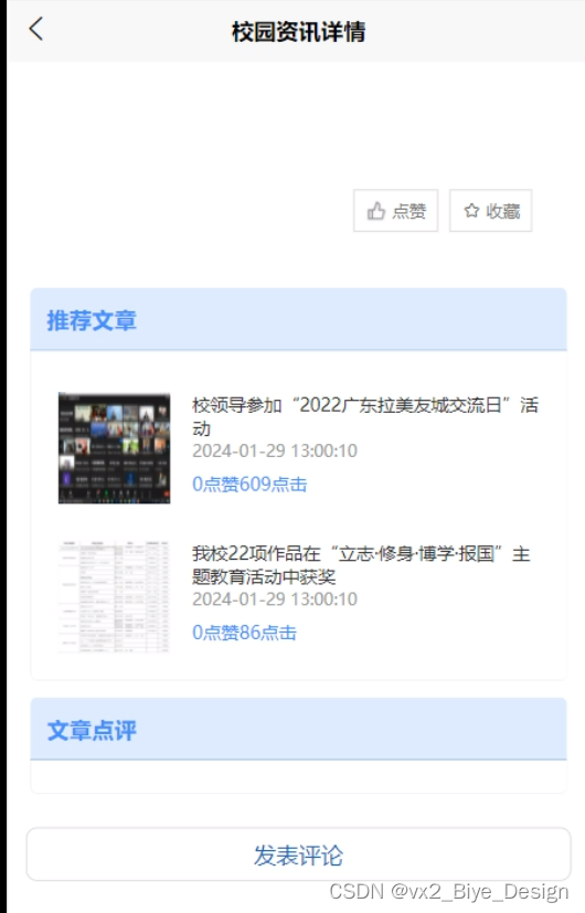 在校园资讯页面,用户可以轻松获取有关新闻的详细信息,还可以通过关键字快速搜索,同时还可以进行点赞、评论、收藏等功能,如图5-4所示。