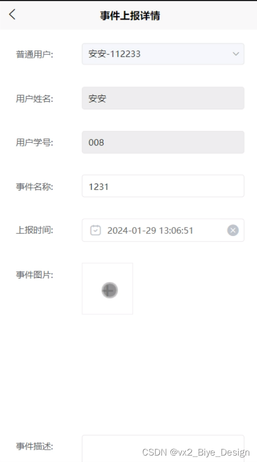 事件上报页面可以查普通用户、用户姓名、用户学号、事件名称、上报事件、事件描述等信息,并可以进行提交等操作。如图5-5所示。